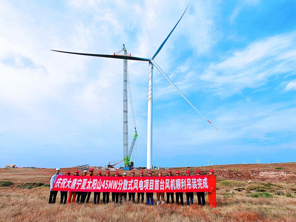 新华网银川10月15日电(记者苏醒)日前,随着108米长的风机叶轮与主机在百米高空精准对接,大唐宁夏太阳山45MW分散式风电项目首台风机吊装成功,标志着项目进入设备安装阶段,向11月底并网发电目标迈进关键一步。