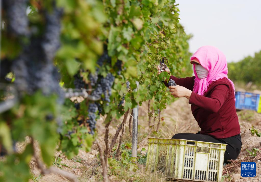 农户在银川市永宁县闽宁镇葡萄地里采摘酿酒葡萄(10月14日摄)。新华社记者 杨植森 摄