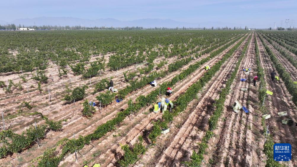 农户在银川市永宁县闽宁镇葡萄地里采摘酿酒葡萄(无人机照片,10月14日摄)。新华社记者 杨植森 摄