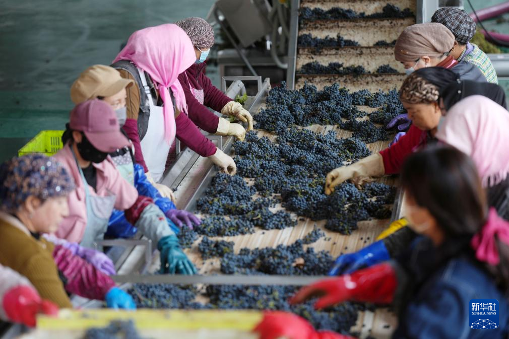 工作人员在银川市永宁县闽宁镇的贺兰红酒庄对酿酒葡萄进行压榨处理(10月14日摄)。新华社记者 杨植森 摄